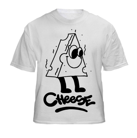 A cool simple happy cherpy chap cartoon line drawing / illustration of a block of cheese along with the text "cheese" written underneath printed in black on a white heavy cotton T-shirt.